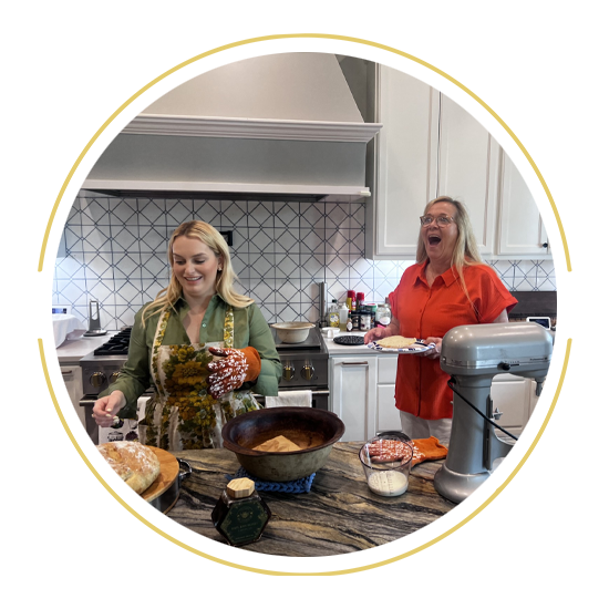 Host a memorable and delicious experience right from your own kitchen! My in-home cooking classes are perfect for birthdays, girls’ nights, or just a fun reason to gather. With a 10-person minimum, each guest will receive a signed copy of my cookbook to take home. My Bread & Butter class starts at $40 per person and teaches the art of homemade bread in a way that’s simple, fun, and foolproof. Want to take it up a notch? I also offer main entrée classes using recipes straight from my cookbook—starting at $75 per person. Everything is hands-on, heartfelt, and guaranteed to leave your kitchen smelling amazing.